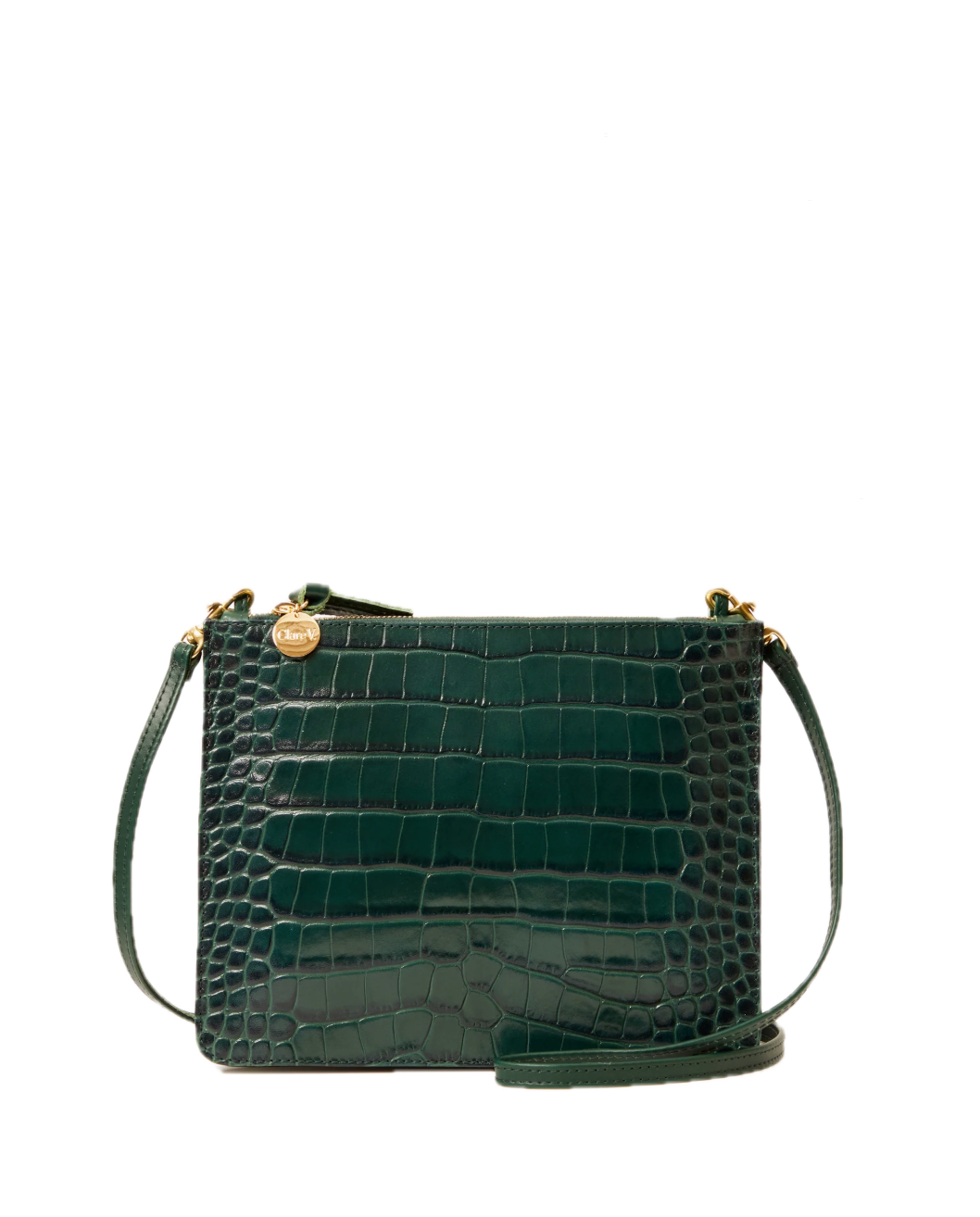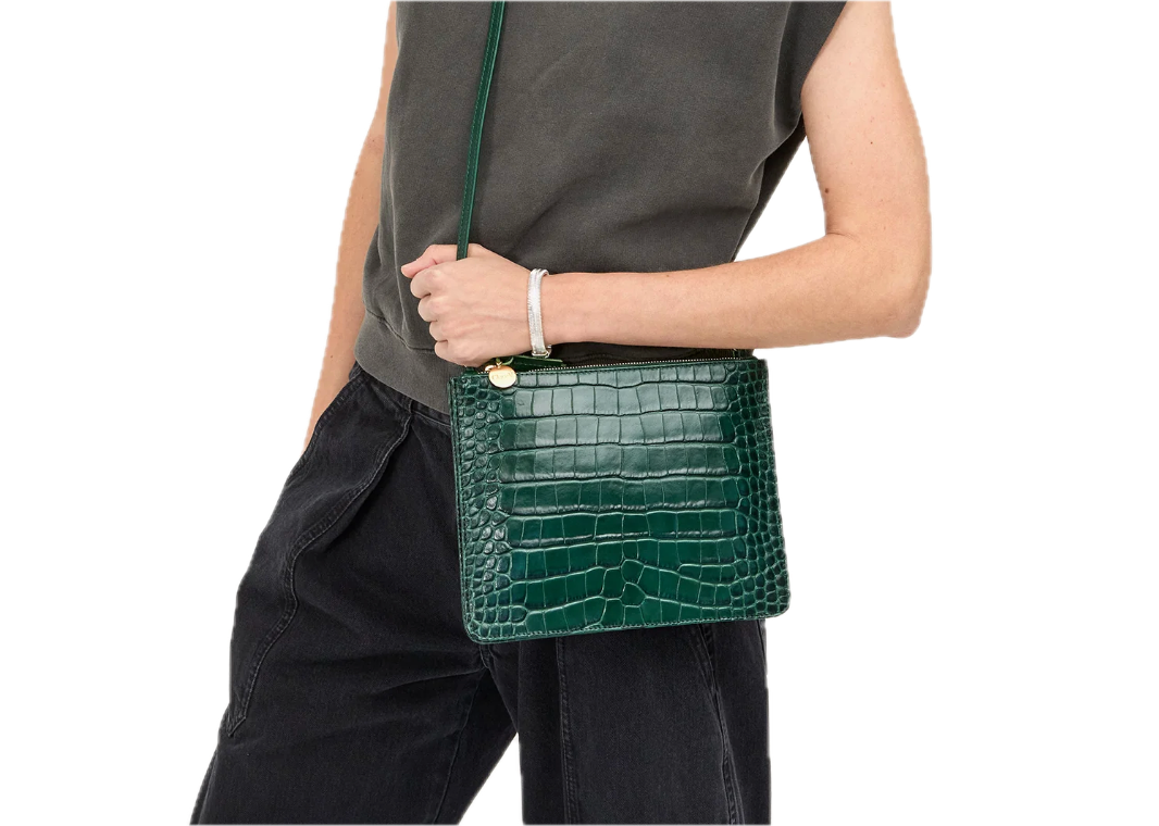 - Twice as nice, double the fun, two zippered pouches instead of one! With a detachable crossbody strap & made of vegetable-tanned Italian leather with croco emboss.