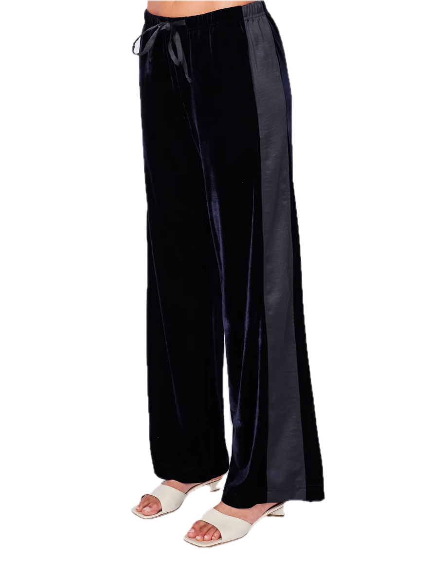 Crushed velvet wide leg pants with ribbon drawstring in new navy. A smooth feel and classy look to any outfit. Pair with the crushed velvet tank.