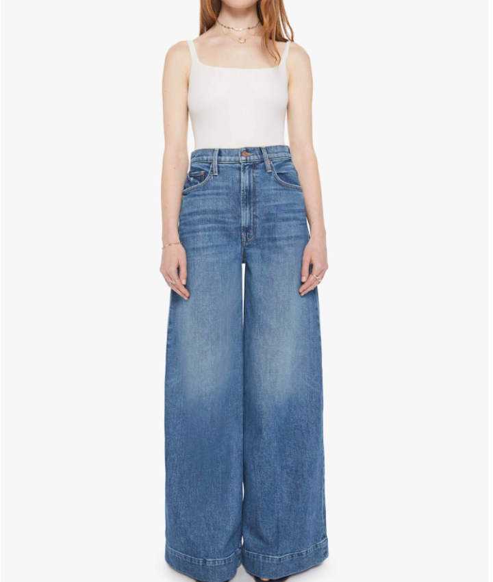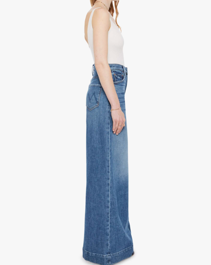 Shake it up. Super high-waisted wide-leg jeans with a long 32-inch inseam and a clean, wide hem. Made from semi-rigid denim, Tambourine Man is mid blue with subtle whiskering and fading at the knee.These jeans are semi-rigid and take time to break in. MOTHER says patience is a virtue.