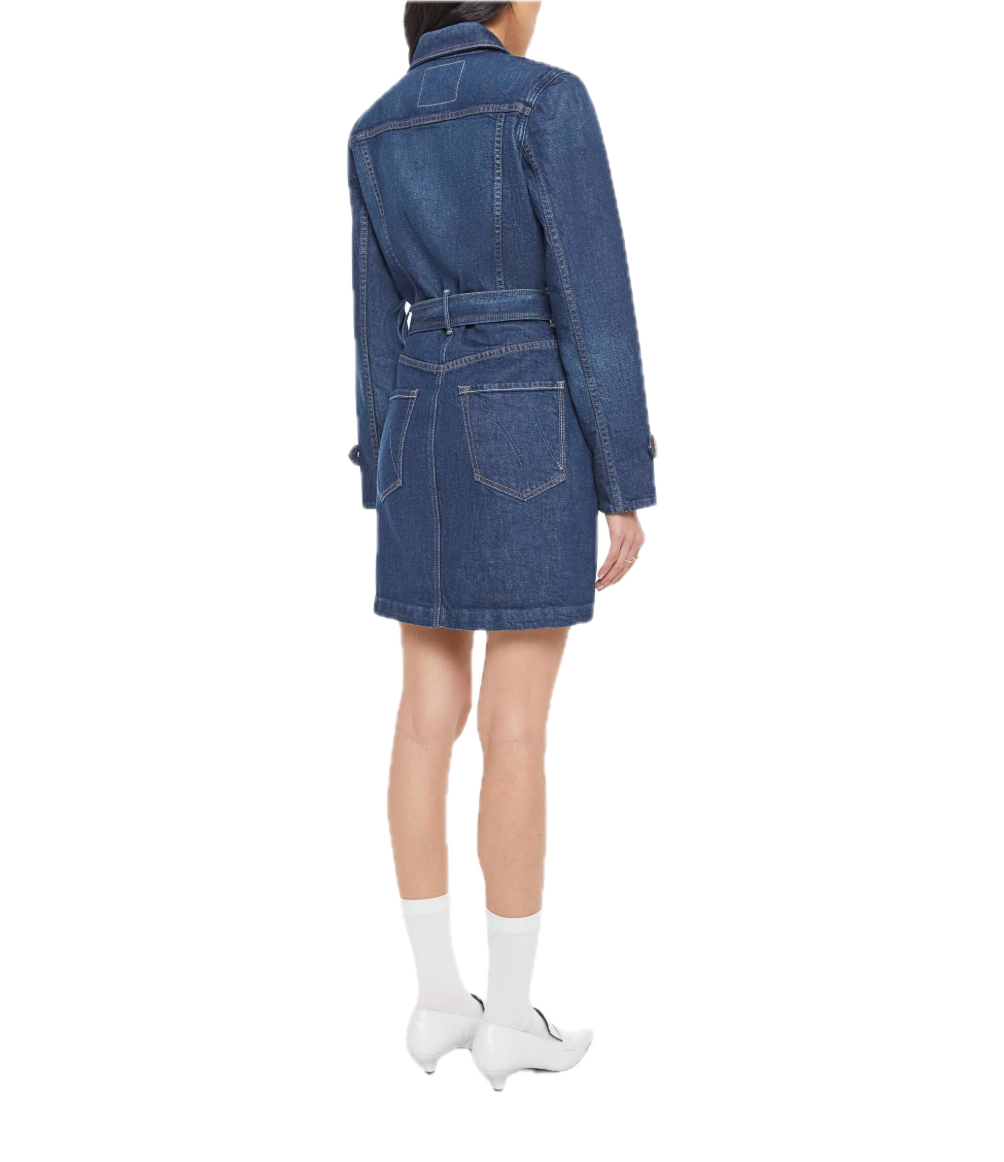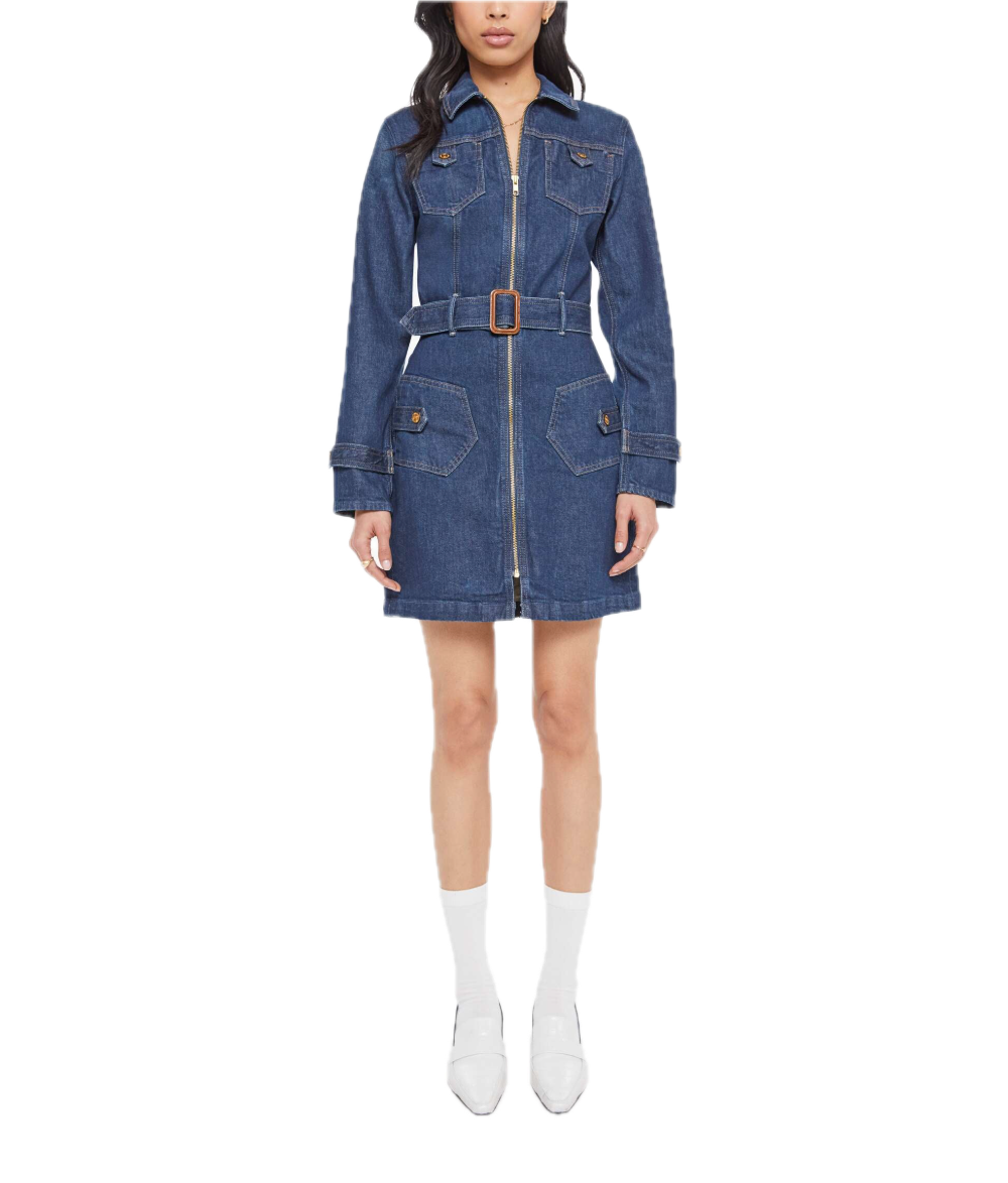 Amped up. A collared denim mini dress with long sleeves, a zip closure, belted waist, patch pockets and a hem that hits mid-thigh. Made from semi-rigid SUPERIOR denim, Kicks And Riffs is a dark blue with subtle fading.