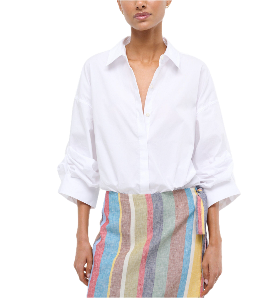 A cotton poplin shirt bodysuit, the Traverse takes the guesswork out of styling an oversized shirt by offering a fixed rolled cuff and adjustable elastic bottom.