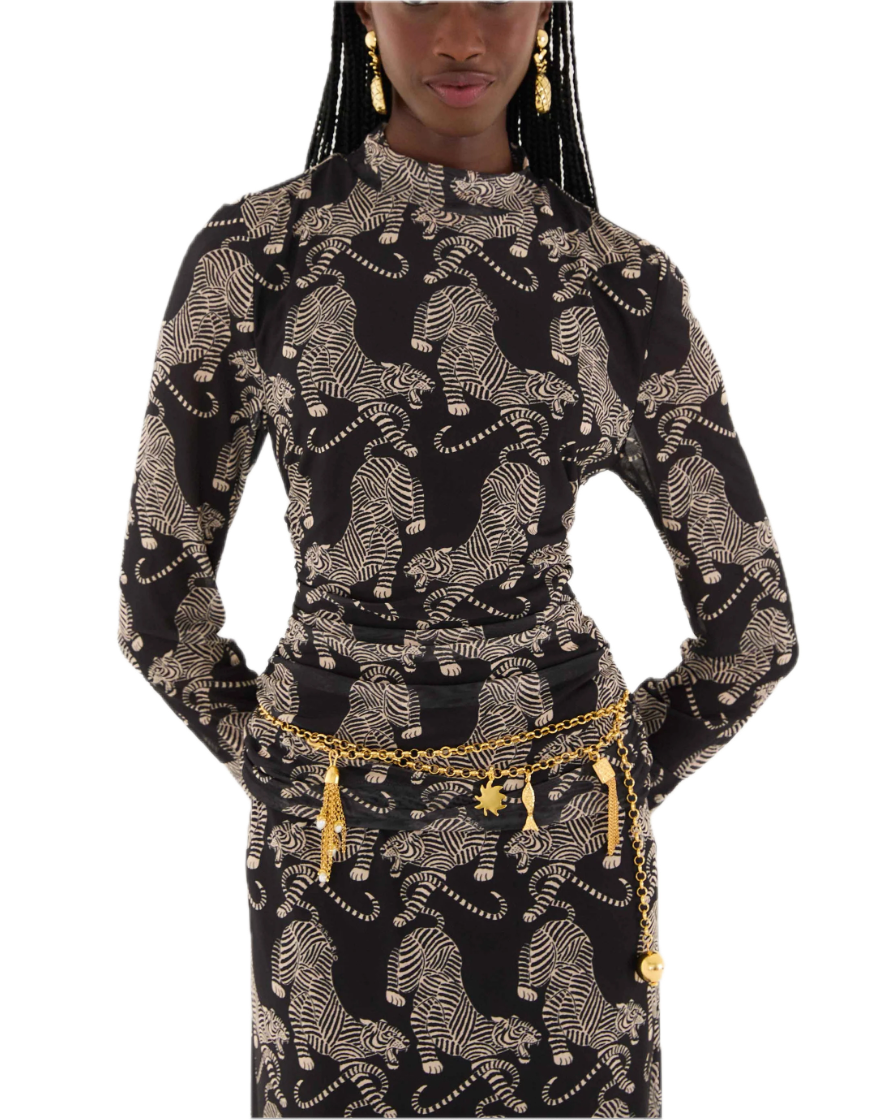 Embrace a bold charm with the Black Striped Tigers Long Sleeve Tulle Blouse by FARM Rio. Its high neckline gracefully frames the collarbone, while the sheer tulle fabric brings a whisper of softness to the striking black base. The playful beige tiger print, detailed with dynamic stripes, enlivens the silhouette, and gentle ruching at the waist adds a flattering, figure-enhancing touch. This top effortlessly balances elegance and spirited fun.