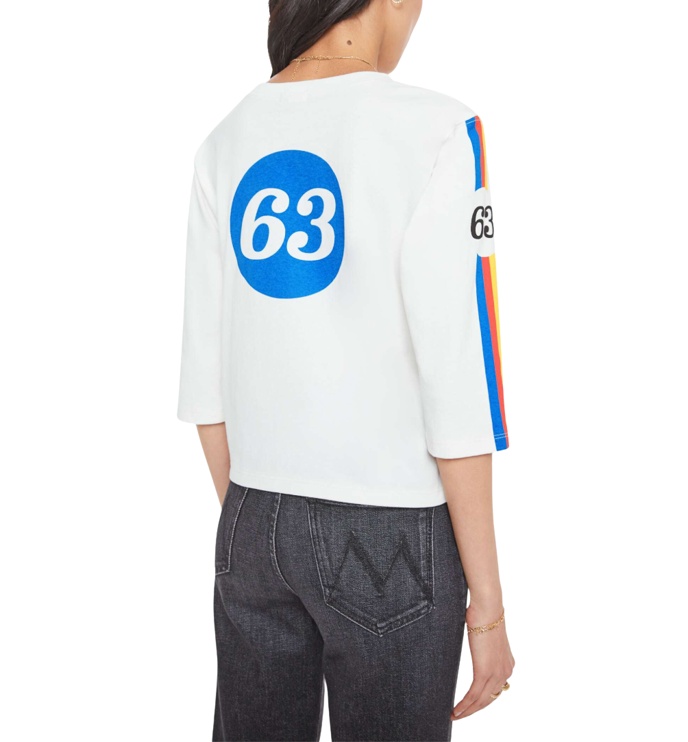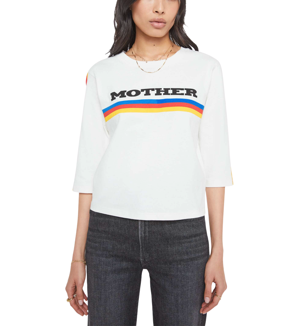 Need for speed. A crewneck tee with elbow-length sleeves and a loose, boxy fit. Made from 100% cotton, The Better Half in MOTHER 63 features colorful stripes across the chest, MOTHER's name in black on the front and a Vespa-inspired 63 graphic on the back.