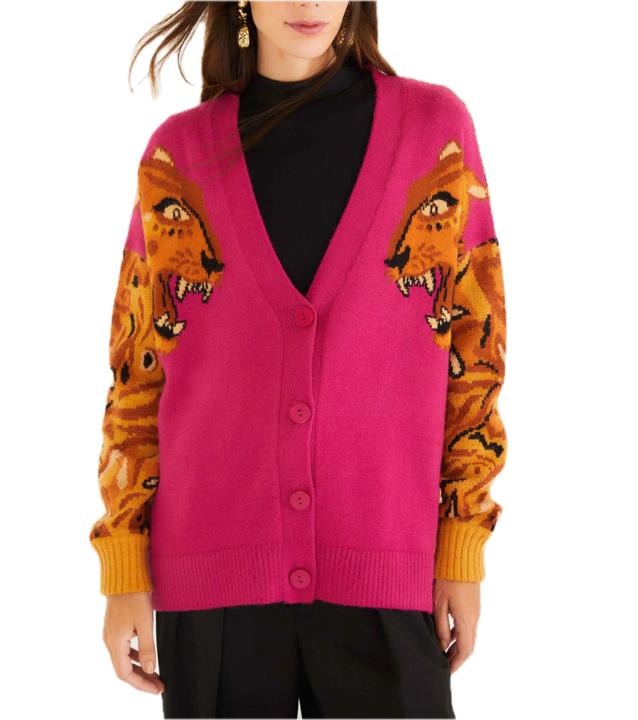 Embrace bold warmth with this Pink Bold Tiger Buttoned Knit Cardigan by FARM Rio. Its vibrant fuchsia body beautifully contrasts with sleeves and back adorned by a striking tiger motif in rich oranges and browns. The relaxed fit and deep V neckline invite comfort and ease, while the playful feline design adds a wild spirit that turns everyday knitwear into a statement of joyful confidence and artistic flair.