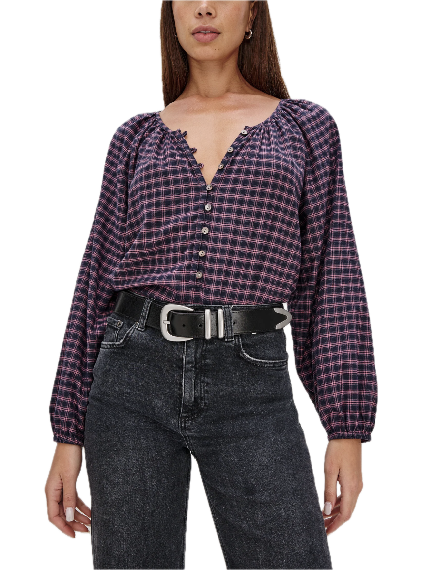 The Indi is a 60s-inspired transitional blouse crafted from a luxe brushed cotton blend with sheer voluminous sleeves and natural shell buttons. This top flows in a babydoll silhouette with elasticated cuffs.